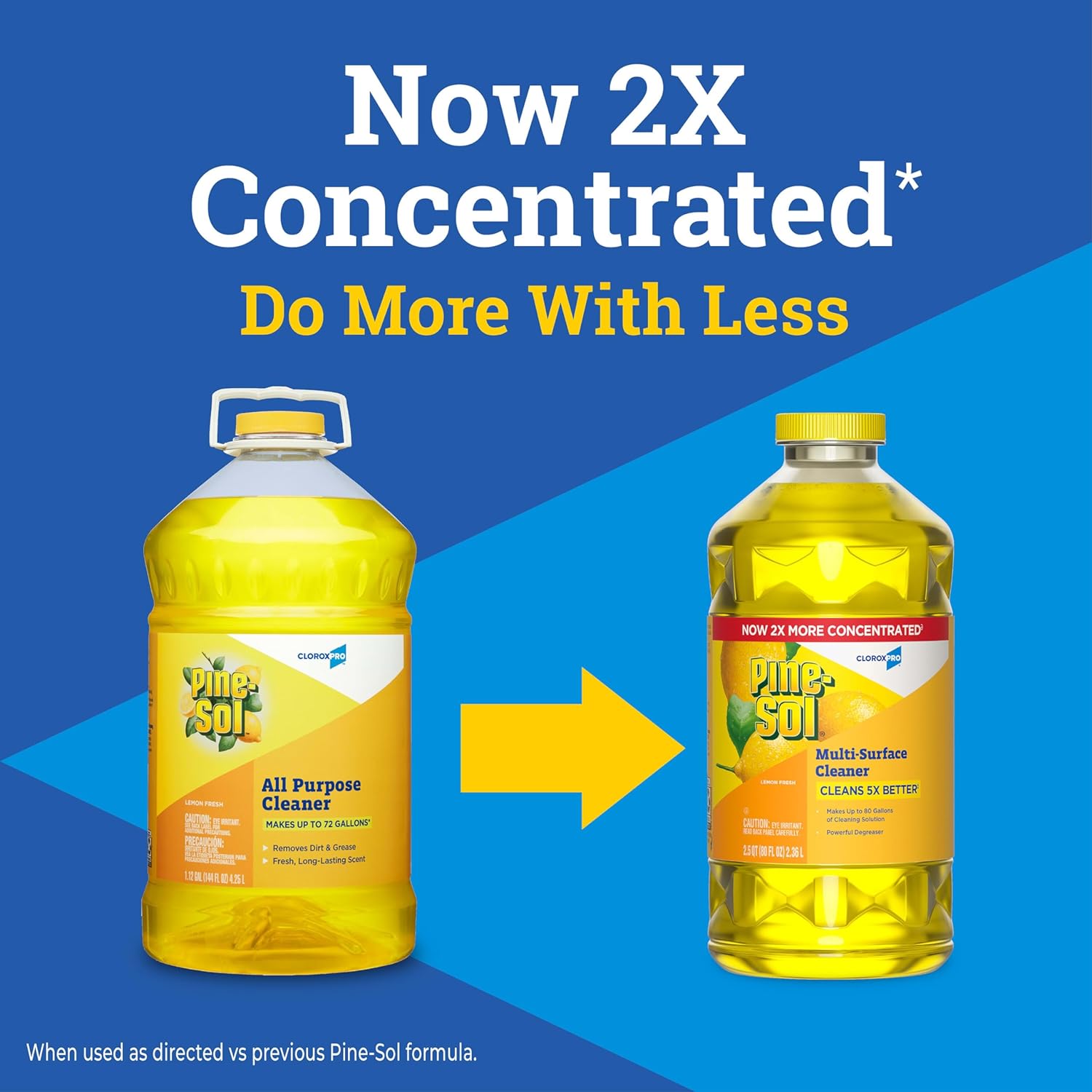 Pine-Sol is now 2X concentrated, delivering more cleaning with less waste. With twice the cleaning power per ounce, you get more diluted gallons of use from a smaller bottle.Plus, the new formula cleans up to 5 times better than before.Clean, degrease and deodorize confidently with the power of Pine-Sol.- Capacity: 80 oz.